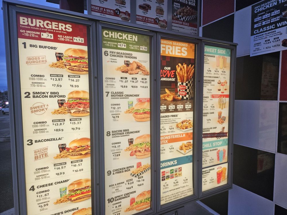 New Smoky BBQ Bacon Buford features three 100% beef hand-seasoned patties topped with Swiss cheese, two slices of smoked bacon, lettuce, tomato, pickles, onions, sweet & smoky BBQ sauce, mayo and even more bits of real chopped up bacon. Its the bigger, bolder and better way to do burgers.