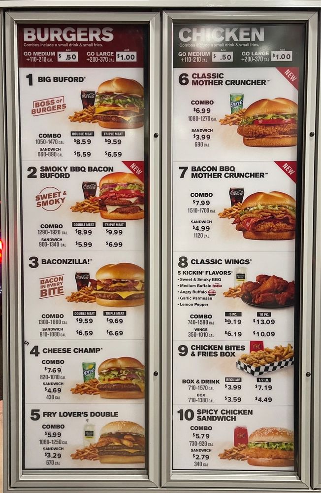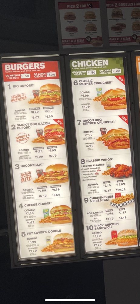 New Smoky BBQ Bacon Buford features two 100% beef hand-seasoned patties topped with Swiss cheese, two slices of smoked bacon, lettuce, tomato, pickles, onions, sweet & smoky BBQ sauce, mayo and even more bits of real chopped up bacon. Its the bigger, bolder and better way to do burgers.